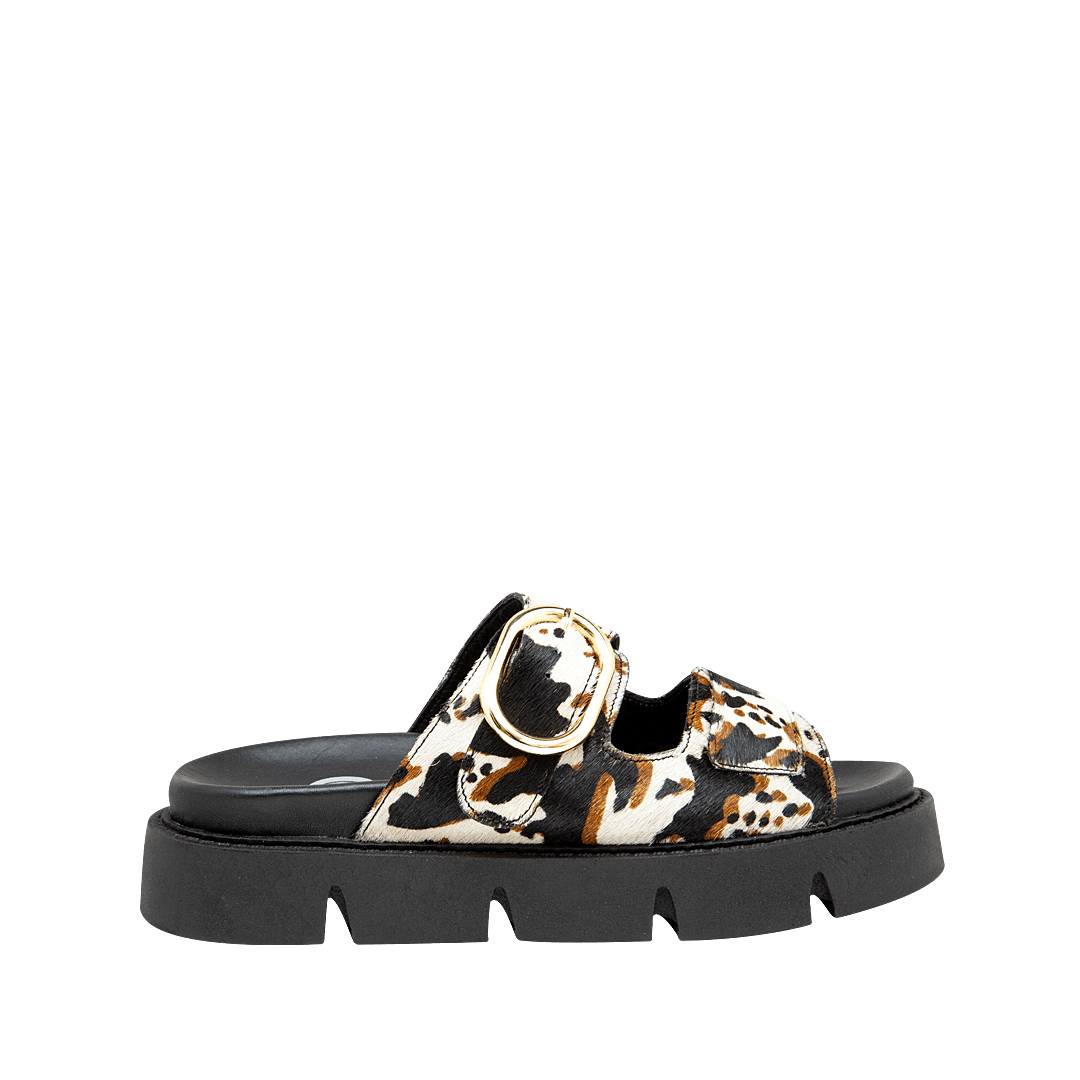 Sandalia de plataforma en cuero estampado vaca (el acabo del fondo es natural y puede variar según la piel)