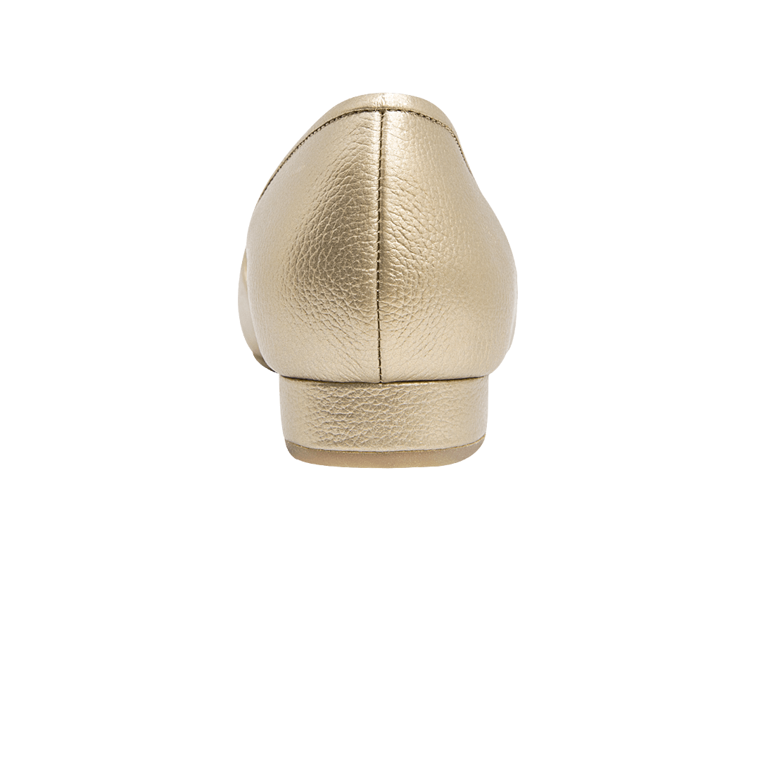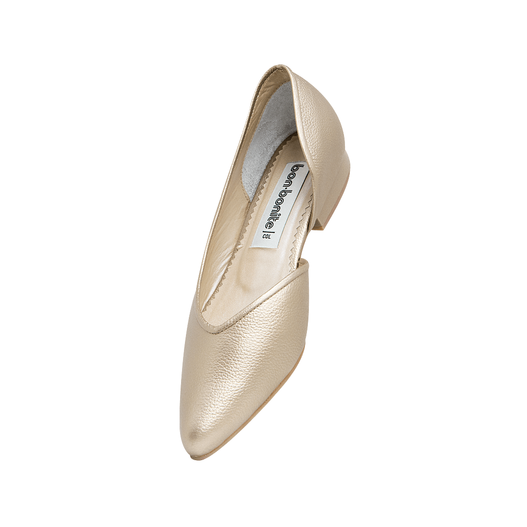 ¡Cómoda y versátil! • Baleta con escote para mujer en cuero metalizado color oro • Acabado en punta • Escote lateral • Mini tacón en caucho • Hecho a mano en Colombia.