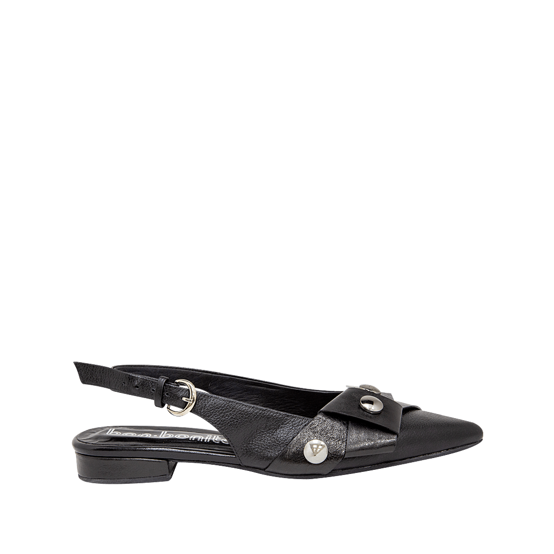 ¡Dale estilo y comodidad a tu caminar! • Baleta para mujer con taches decorativos en cuero granito color mantequilla • Acabado en punta • Hebilla lateral para mejor ajuste • Mini tacón forrado en cuero • Hecho a mano en Colombia.