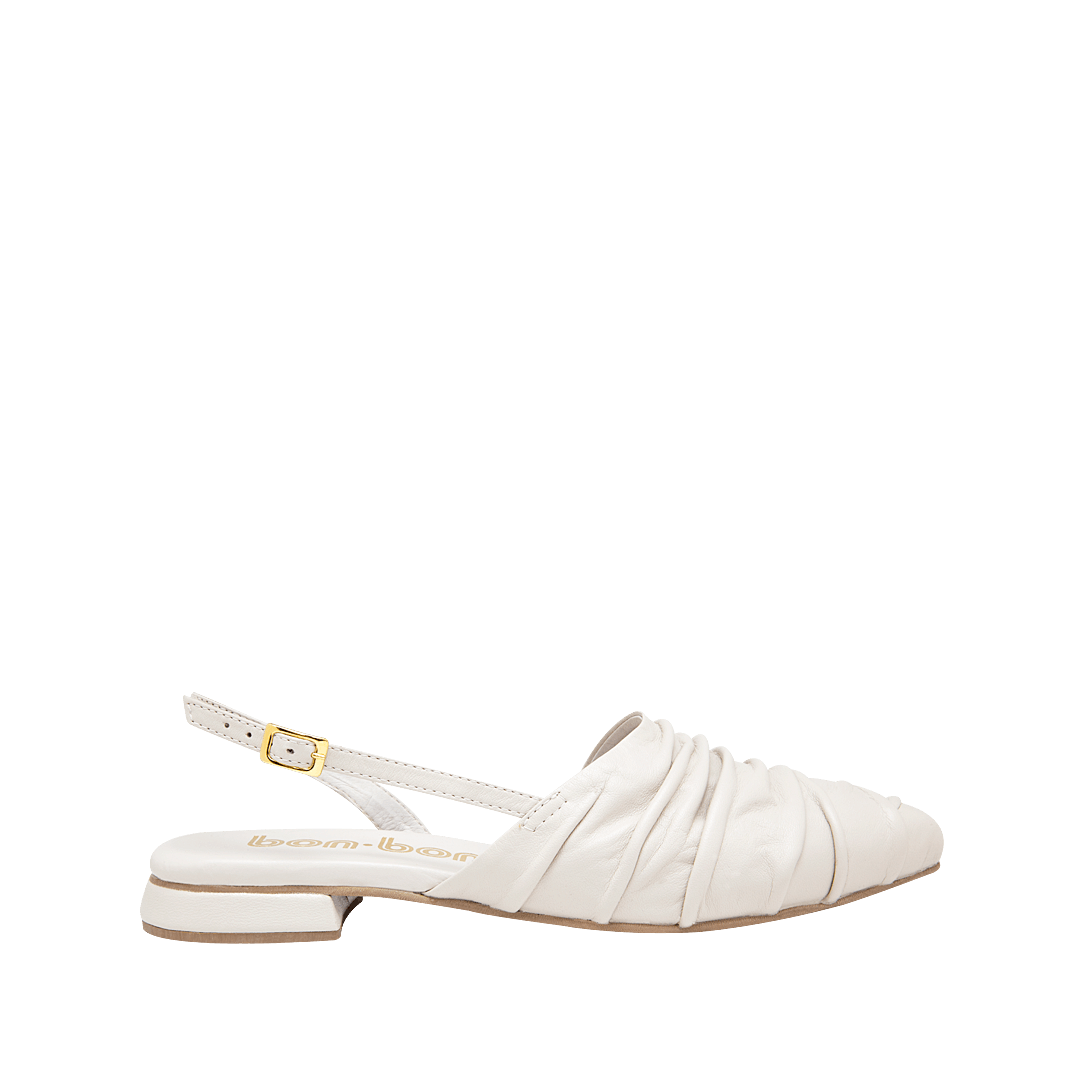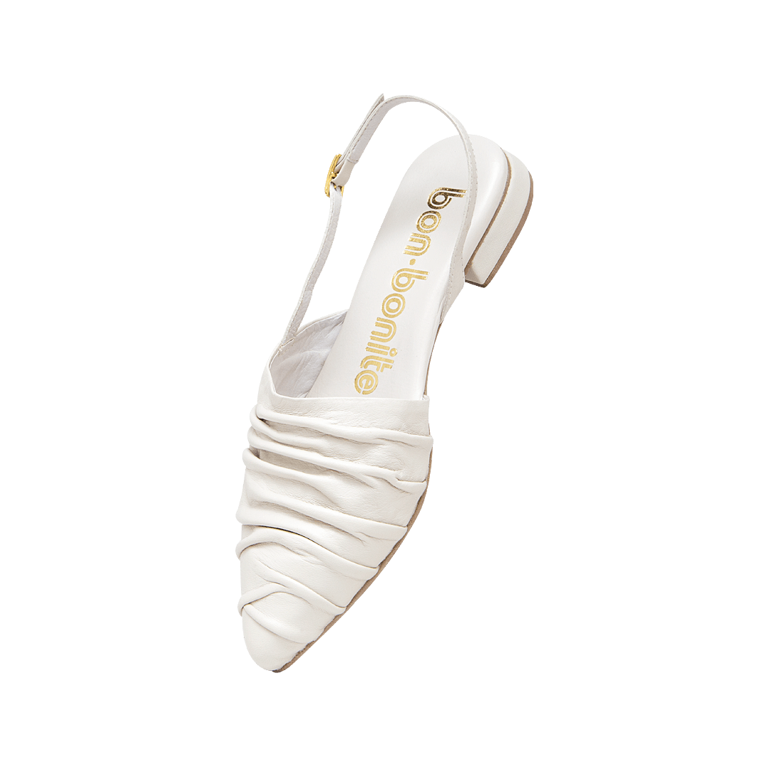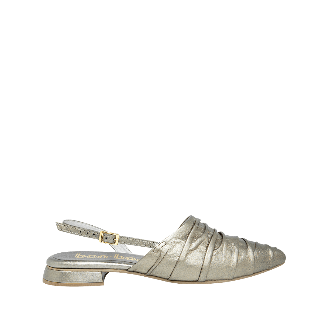 ¡Mucho más que un básico! • Baleta para mujer en cuero drapeado color duna • Acabado en punta • Hebilla y escote lateral • Mini tacón forrado en cuero • Hecho a mano en Colombia.