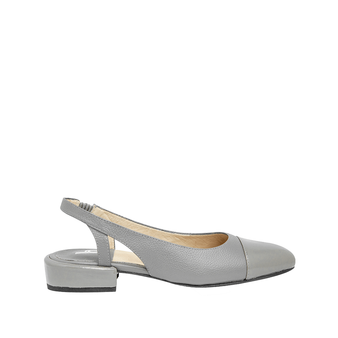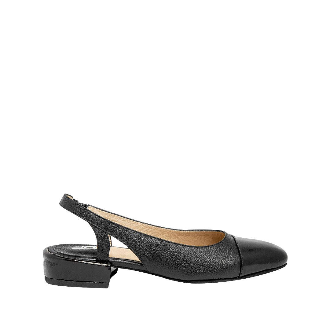 ¡Sutil y cómoda! • Baleta para mujer en cuero granito y liso color negro ónix • Acabado en punta cuadrada • Resorte lateral para mejor ajuste • Tacón forrado en cuero • Hecho a mano en Colombia.