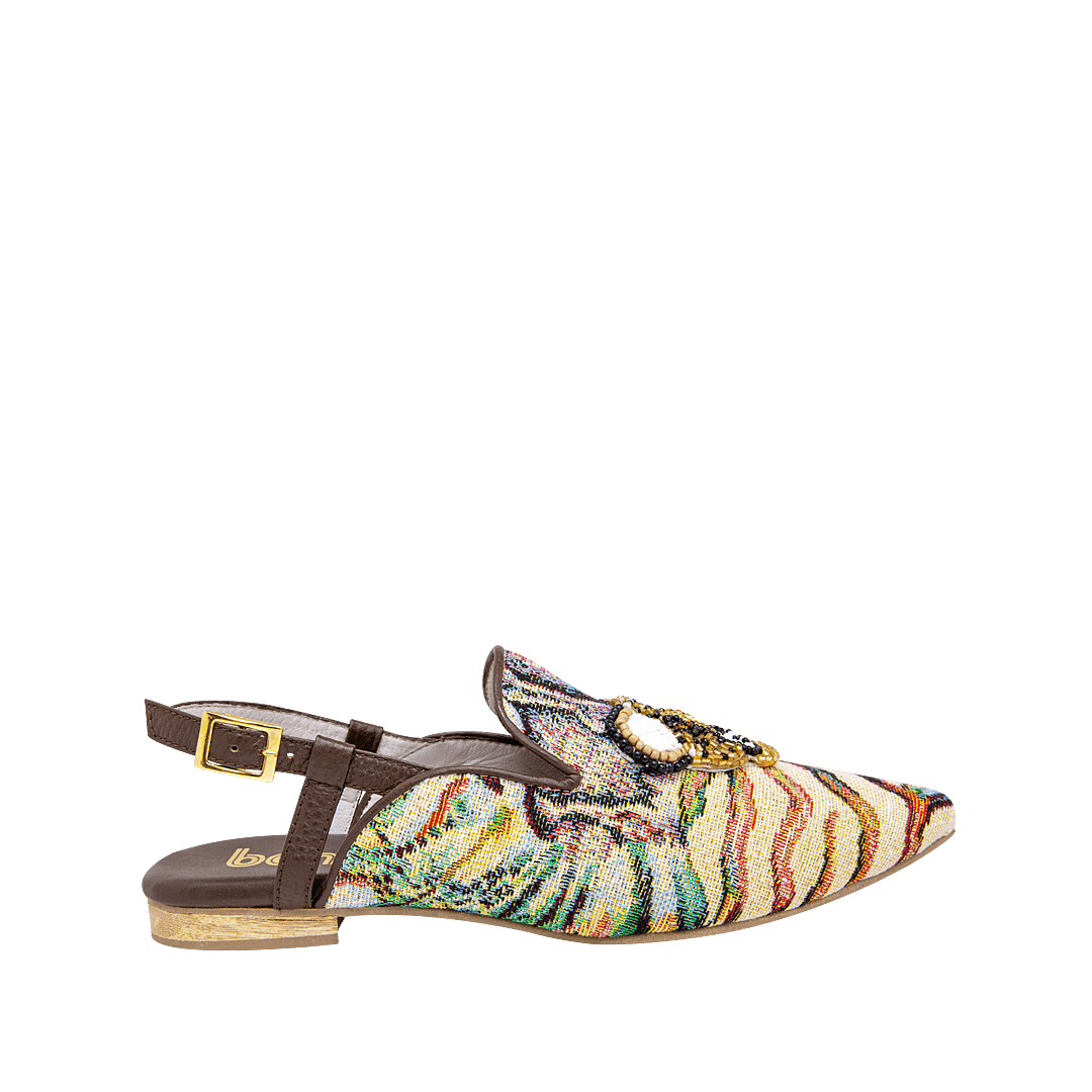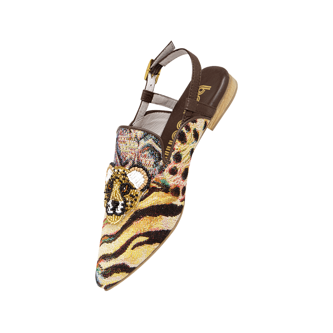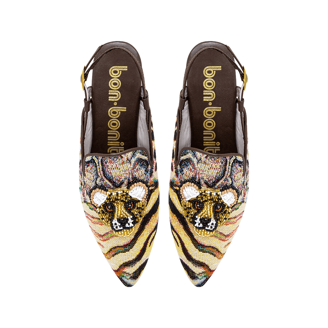 ¡El match perfecto! • Baleta para mujer en textil multicolor • Aplique tejido a mano de chaquiras en forma de puma • Acabado en punta • Hebilla lateral para mejor ajuste • Mini tacón en madera • Hecho a mano en Colombia.