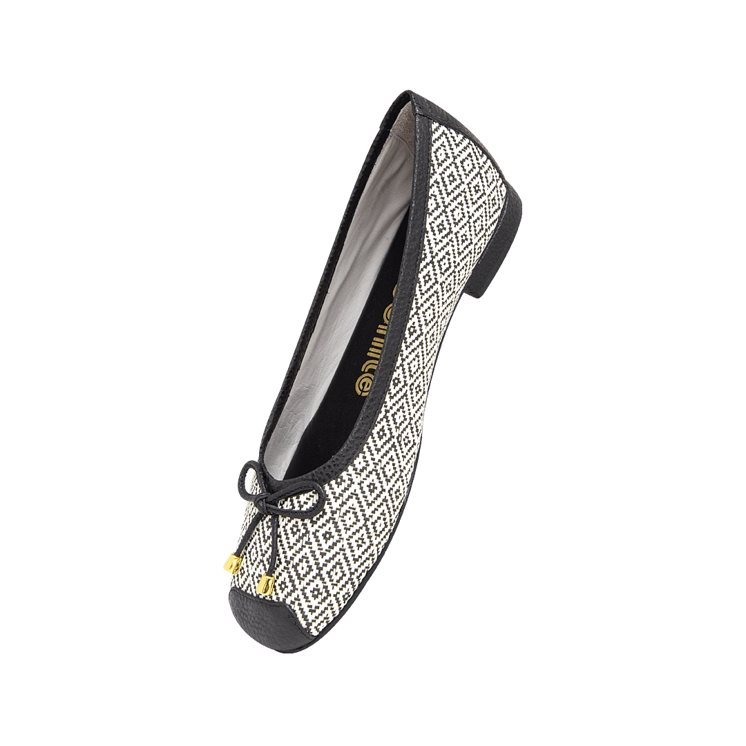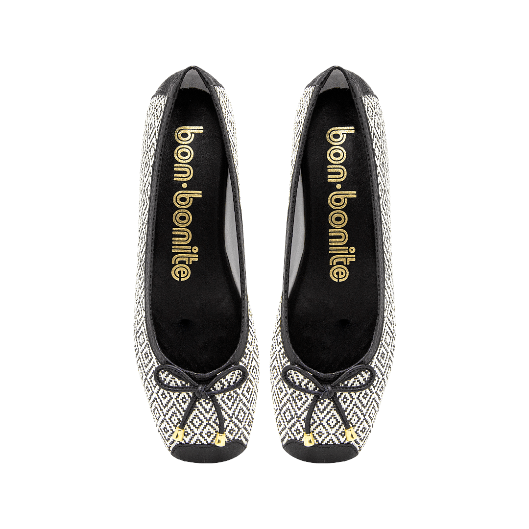 ¡Versátil y moderno! • Baleta para mujer en textil y cuero granito color negro ónix por blanco crema • Moño decorativo en la capellada • Acabado en punta cuadrada • Mini tacón forrado en cuero • Hecho a mano en Colombia.