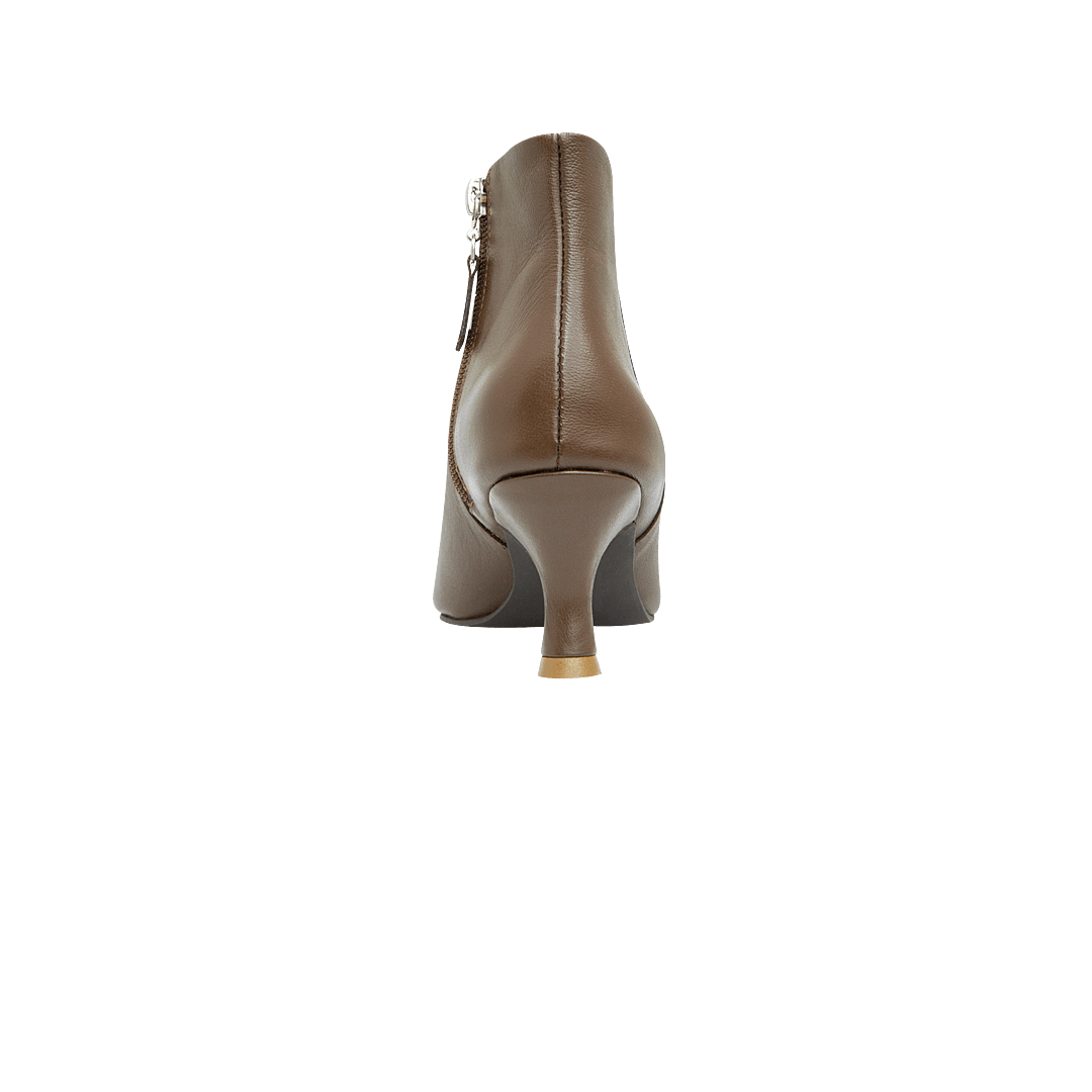 ¡Tu mejor secreto! • Botín para mujer en cuero liso color café • Acabado en punta • Cierre lateral con cremallera • Tacón geométrico • Hecho a mano en Colombia.