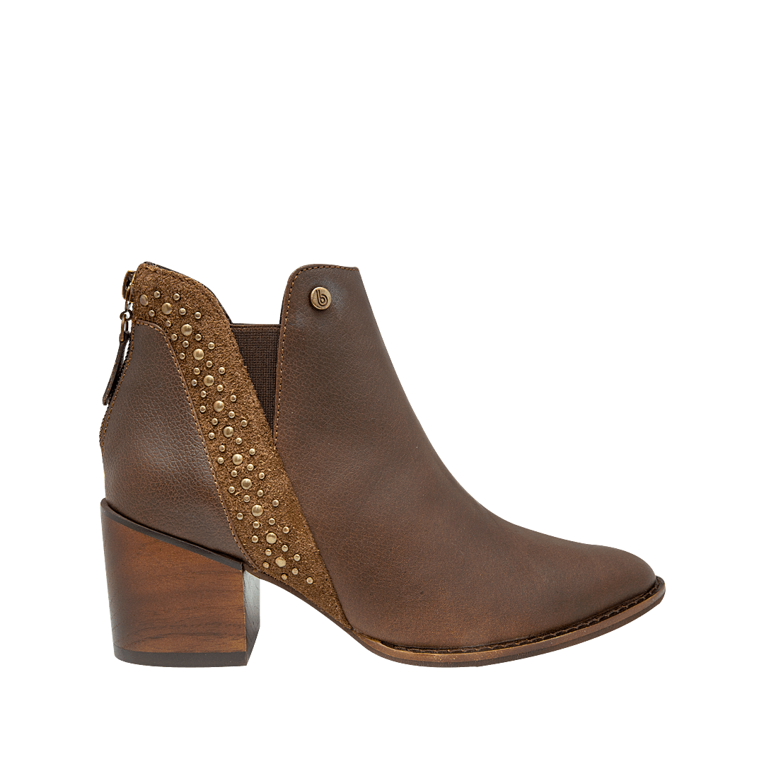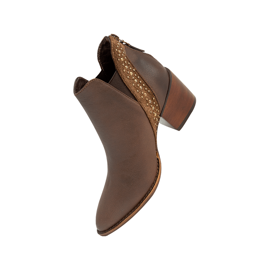 ¡Un básico con carácter! • Botín para mujer con taches en cuero liso y carnaza color miel café • Acabado en punta • Cierre trasero con cremallera • Mini elásticos laterales • Tacón en madera • Hecho a mano en Colombia.