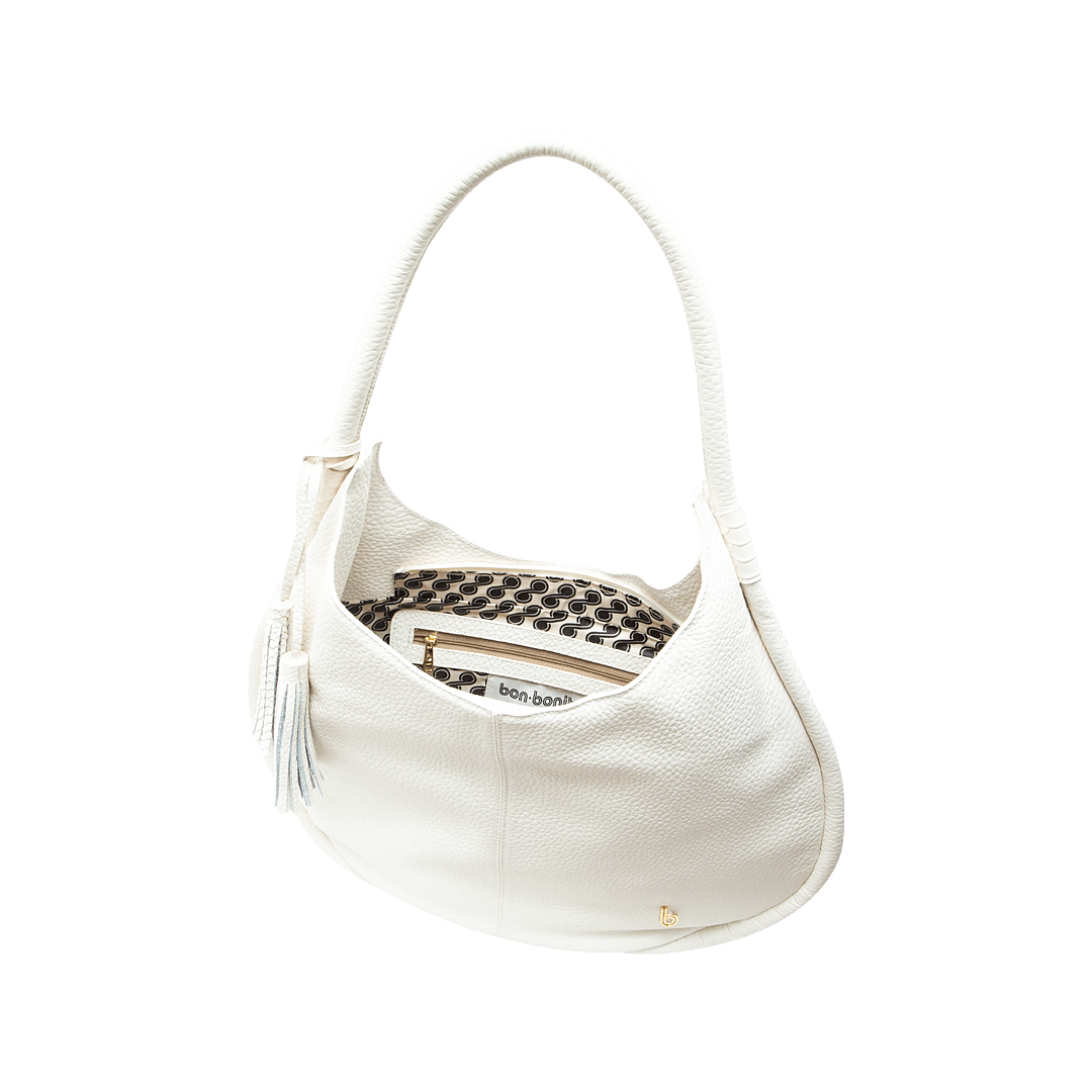 ¡Conquista en cada paso! • Cartera para mujer en cuero granito color chantilly • Cierre mediante cremallera • Un compartimiento interno con cremallera • Dos bolsillos auxiliares • Flecos decorativos en cuero • Asa corta de 47 cm • Hecho a mano en Colombia.