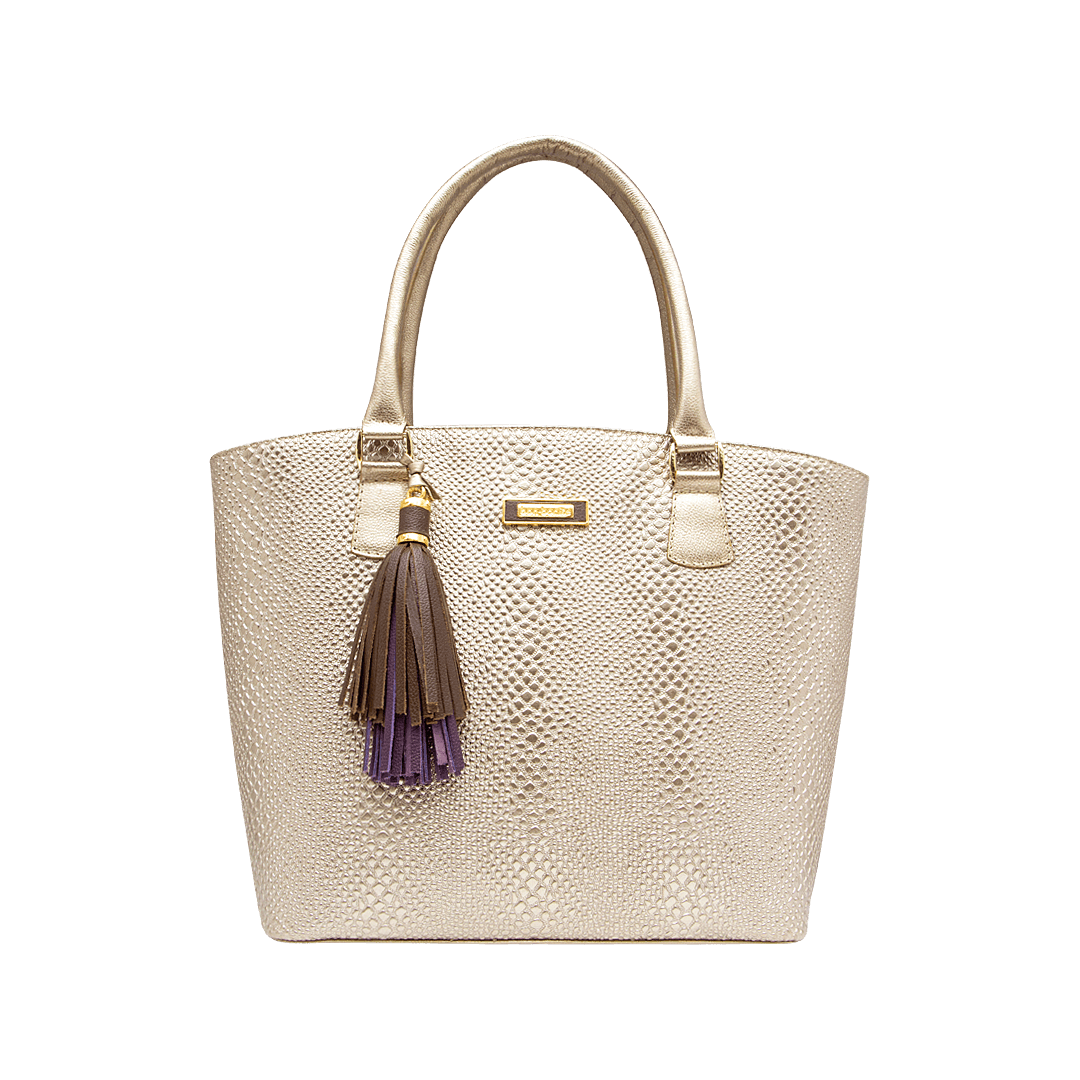 ¡Firmeza y elegancia! • Cartera para mujer en cuero grabado color metal arena • Cierre mediante cremallera • Bolsillo interno con cremallera • Dos bolsillos auxiliares • Fleco decorativo en cuero color cacao y berenjena • Asa corta doble de 53 cm • Hecho a mano en Colombia.