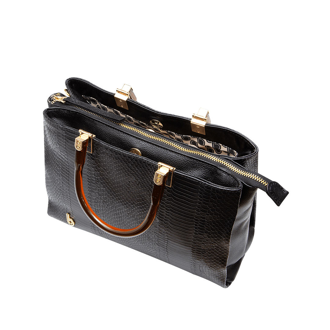 ¡Elegancia en su máxima expresión! • Cartera para mujer en cuero grabado y granito color negro ónix • Cierre mediante cremallera y pin • Un compartimiento interno con cremallera • Dos bolsillos auxiliares • Asa en acrílico corta doble de 29 cm • Asa larga ajustable y removible de 114 cm • Hecho a mano en Colombia.