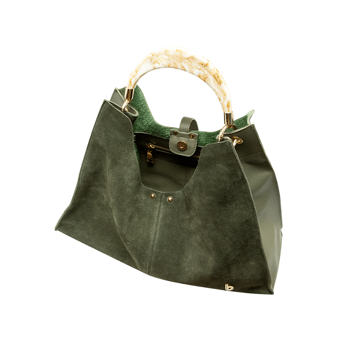 ¡Transforma tu día a día en una pasarela! • Cartera para mujer en cuero carnaza color verde militar • Cierre mediante pin • Bolsillo interno con cremallera • Dos bolsillos auxiliares • Asa corta en acrílico de 28 cm • Asa larga ajustable y removible de 83 cm • Hecho a mano en Colombia.