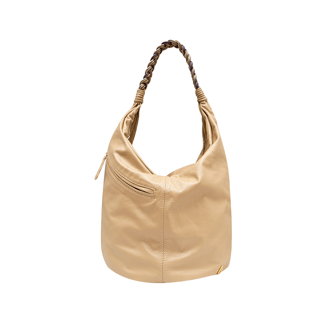 ¡Un estilo sin límites! • Cartera tipo hobo para mujer en cuero confección color capuccino • Cierre mediante cremallera • Bolsillo frontal e interno con cremallera • Dos bolsillos auxiliares • Asa larga trenzada de 43 cm • Hecho a mano en Colombia.