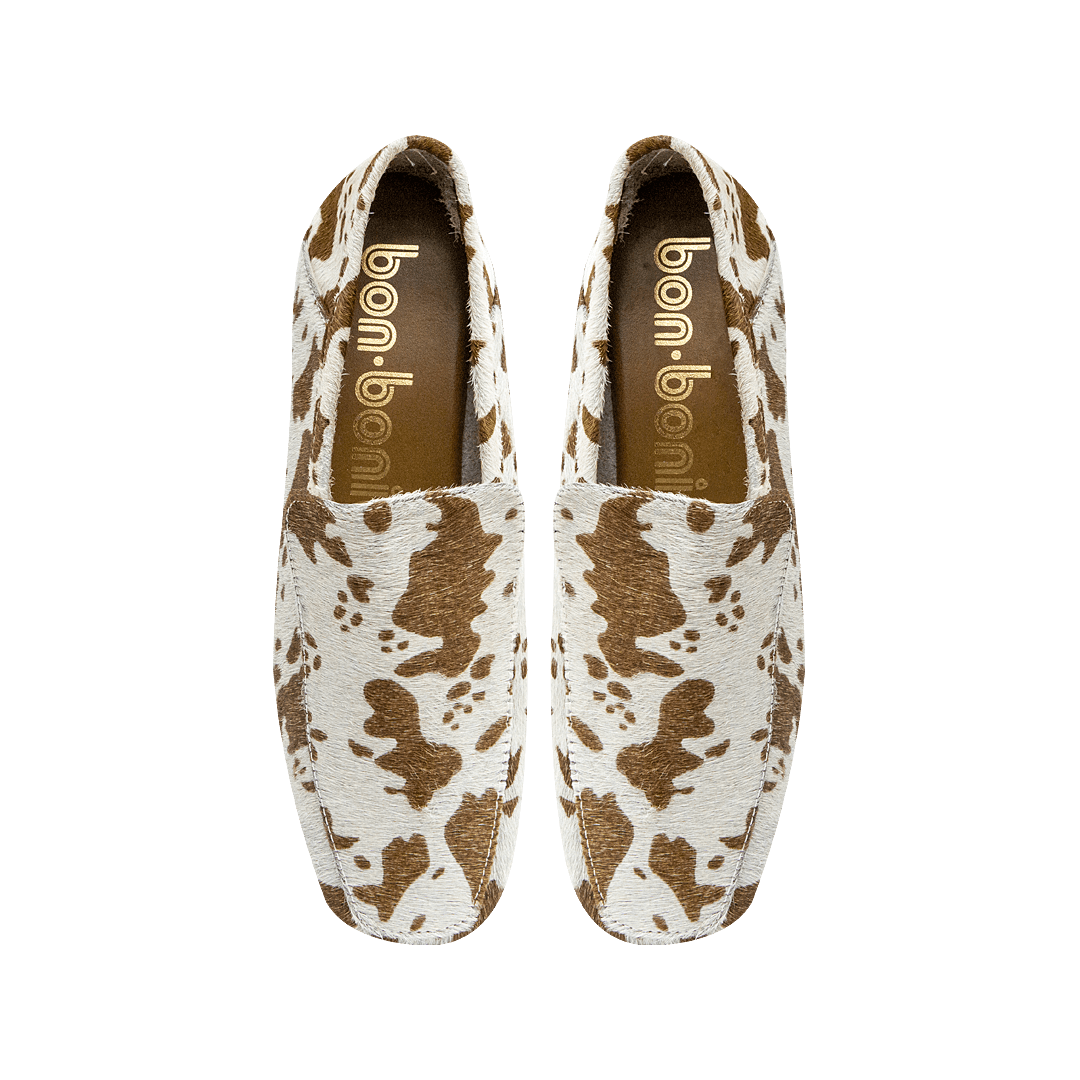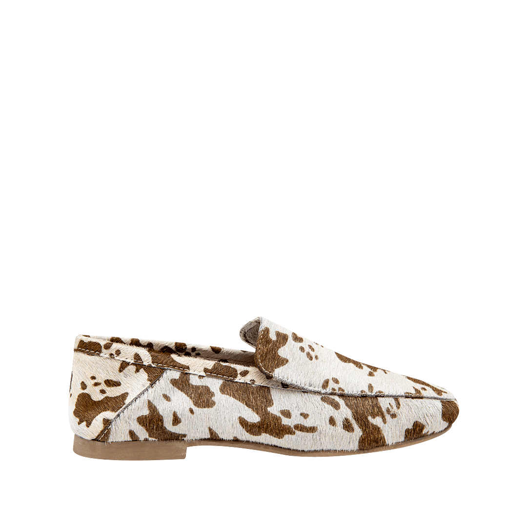 ¡Clásico moderno infaltable! • Mocasín para mujer en cuero con acabado en pelo animal print tipo vaca • Acabado en punta cuadrada • Mini tacón cuadrado • Hecho a mano en Colombia.