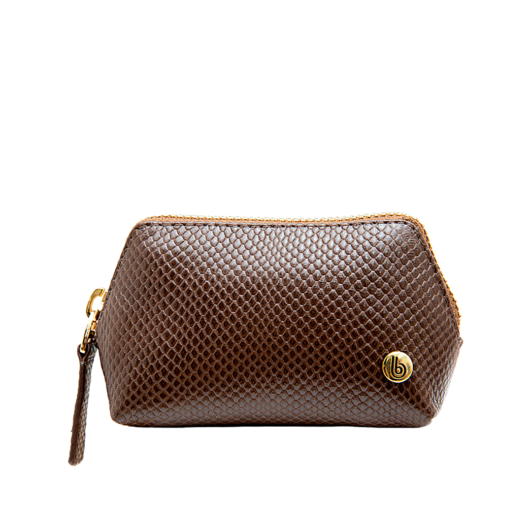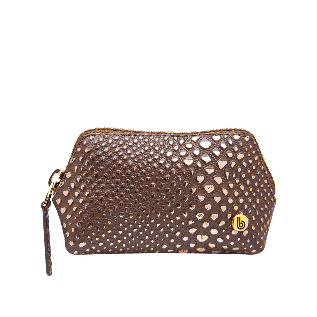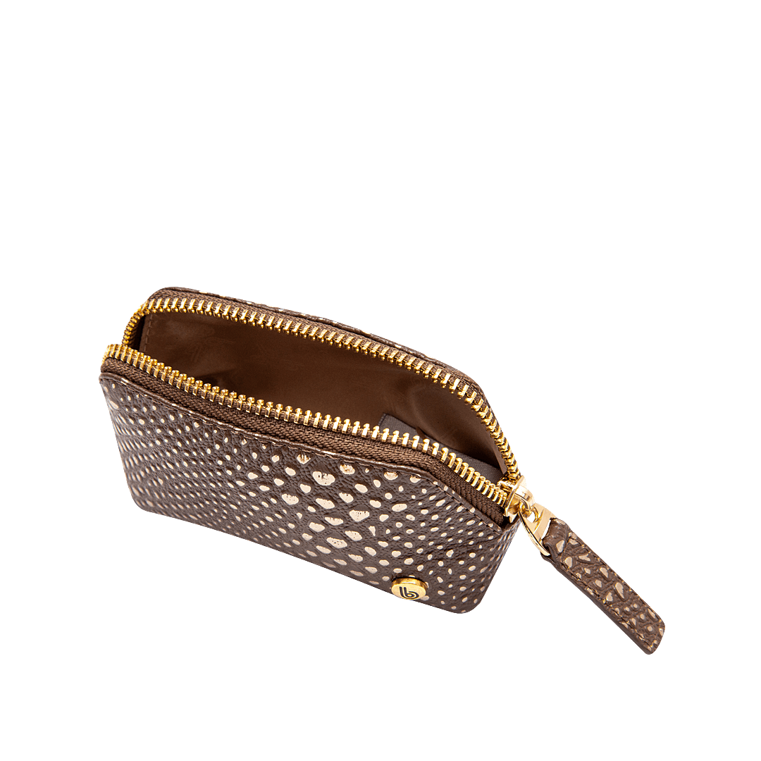 ¡Perfecto y práctico! • Monedero para mujer en cuero grabado color cacao con destellos metalizados • Cierre mediante cremallera • Hecho a mano en Colombia.