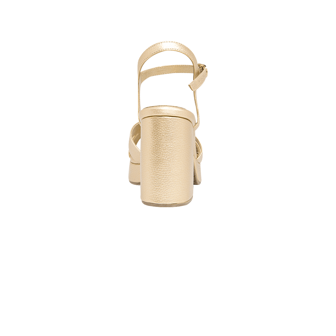 ¡Para esos días en que un poco más de altura hace toda la diferencia! • Sandalia de plataforma para mujer en cuero metalizado color oro nuevo • Acabado en punta redonda • Hebilla lateral para un mejor ajuste • Tacón y plataforma forrado en cuero • Hecho a mano en Colombia.