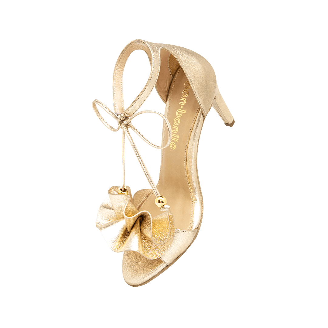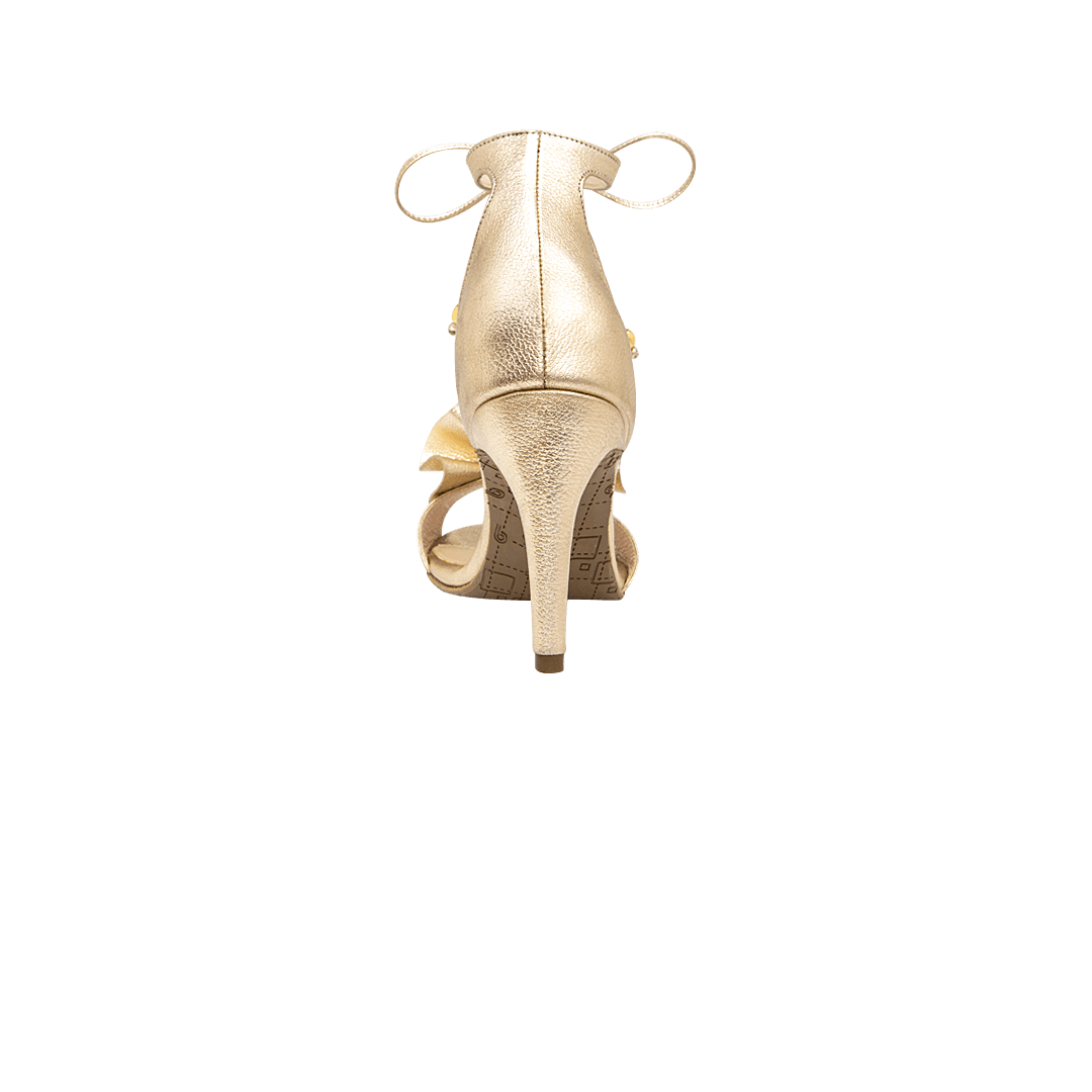 ¡Elegancia en cada paso! • Sandalia de tacón para mujer en cuero metalizado color oro nuevo • Capellada con moño decorativo en cuero • Acabado en punta ovalada • Tacón geométrico forrado en cuero • Hecho a mano en Colombia.