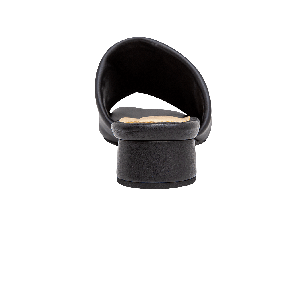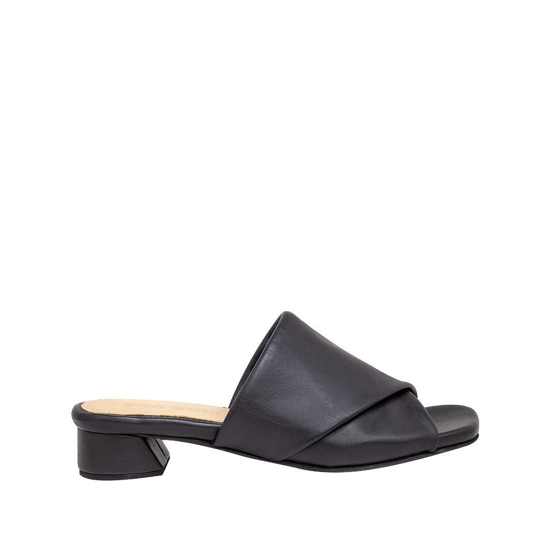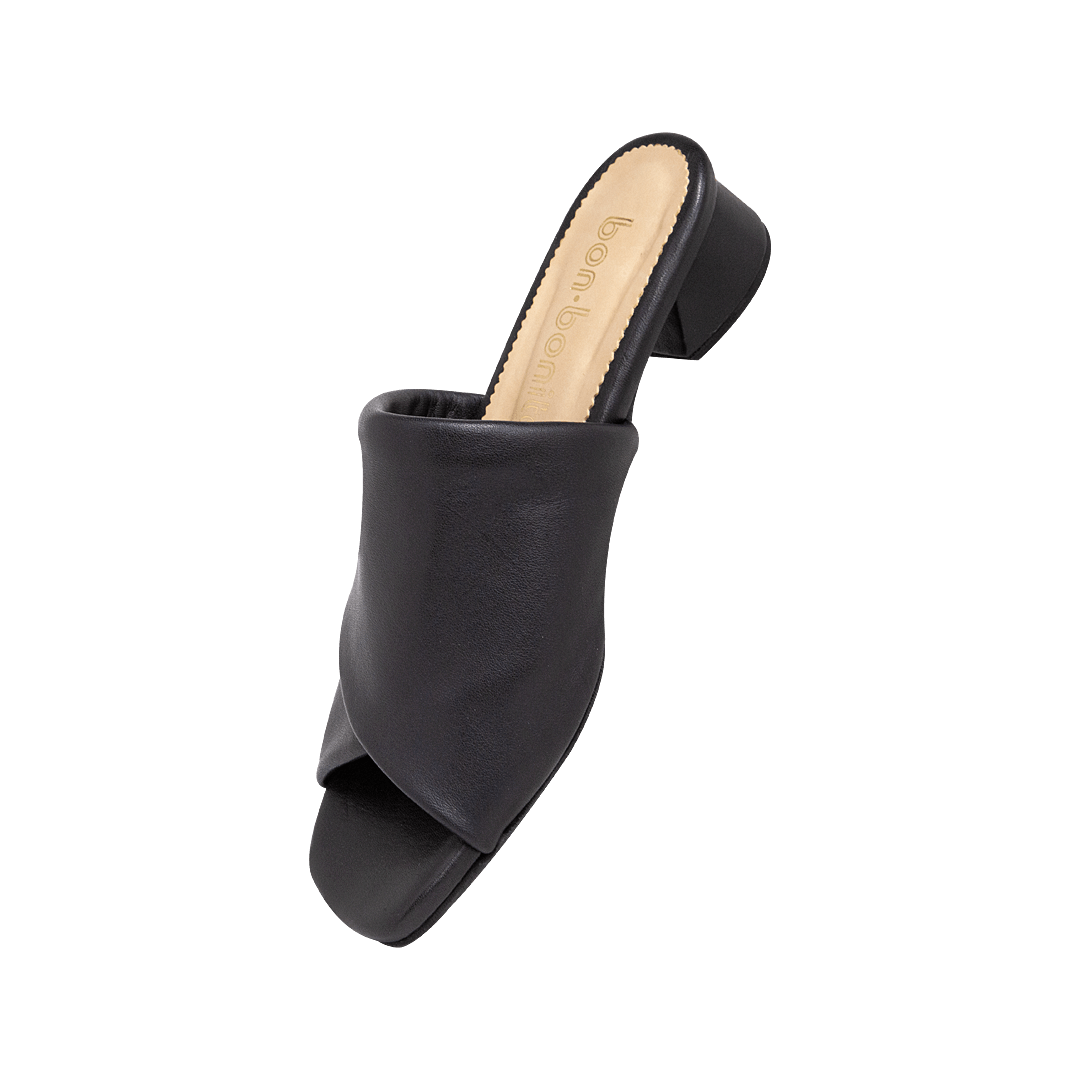 ¡Básico que nunca falla! • Sandalia para mujer en cuero confección color negro ónix • Acabado en punta cuadrada • Mini tacón forrado en cuero • Hecho a mano en Colombia.