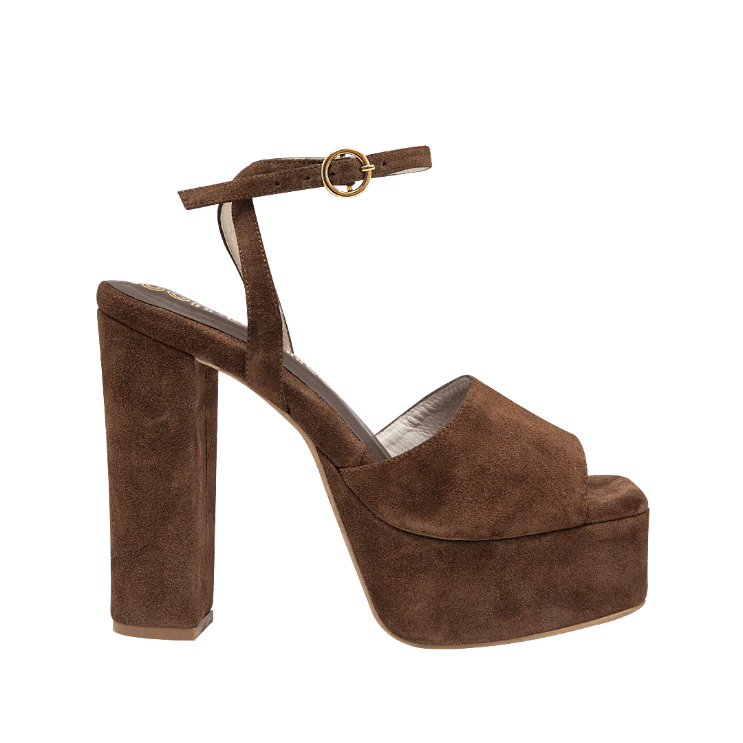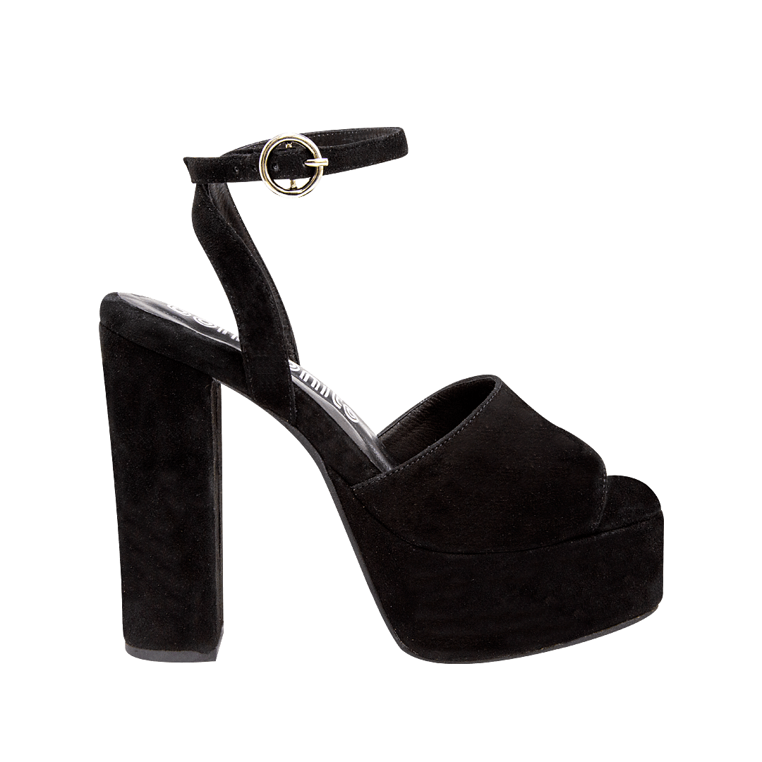 ¡Perfectas para brillar y celebrar con elegancia! • Sandalia de plataforma para mujer en cuero gamuza color negro ónix • Acabado en punta cuadrada • Tacón forrado en cuero • Hebilla lateral para mejor ajuste • Hecho a mano en Colombia.