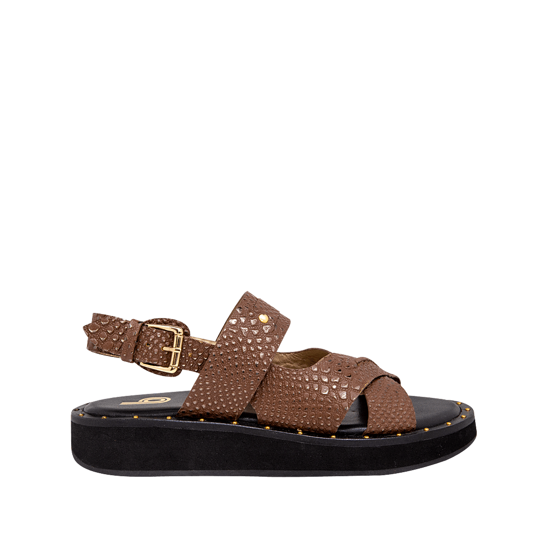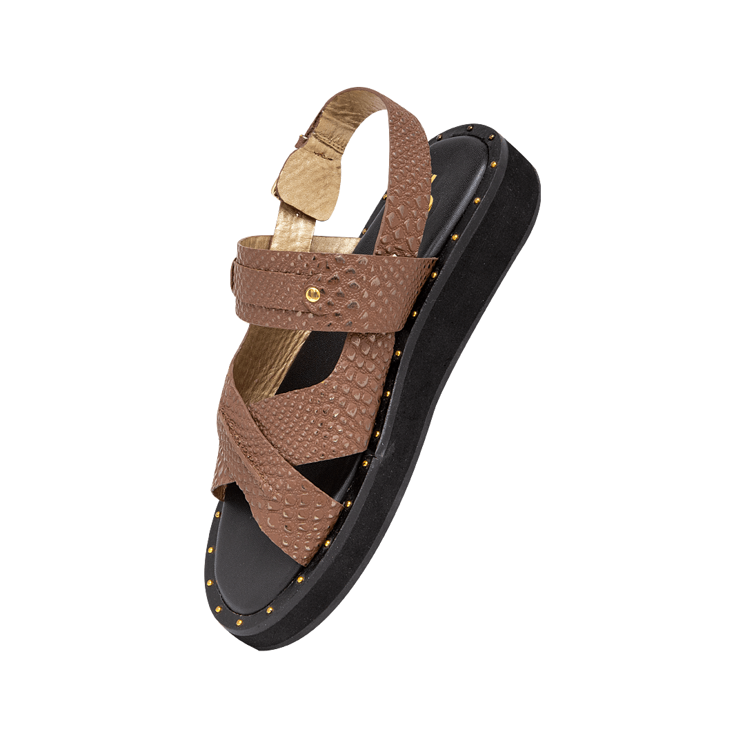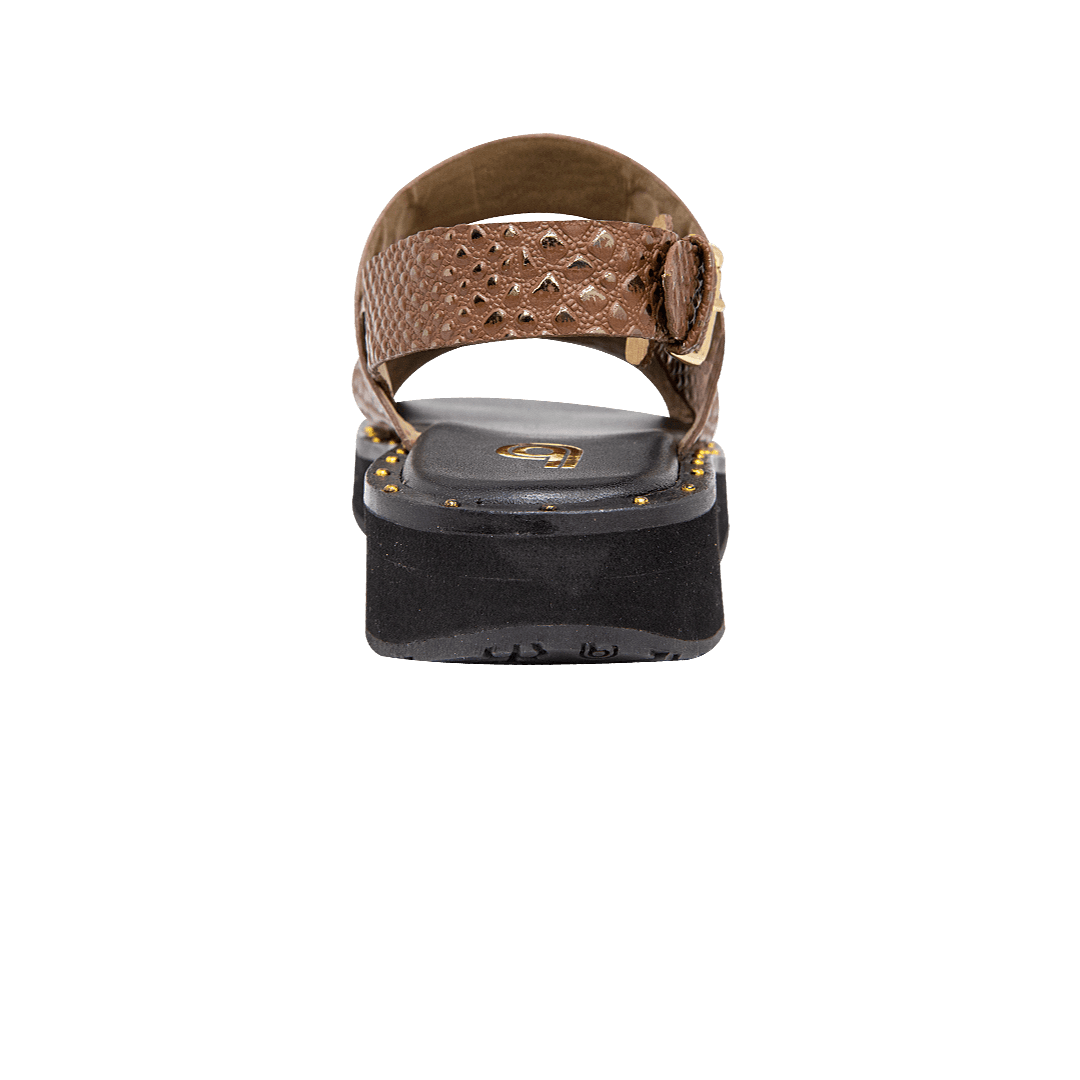¡Elegancia atemporal! • Sandalia para mujer en cuero grabado con destellos metalizado color mustang • Capellada en cuero entrelazado • Hebilla lateral para mejor ajuste • Plataforma con taches decorativos • Hecho a mano en Colombia.