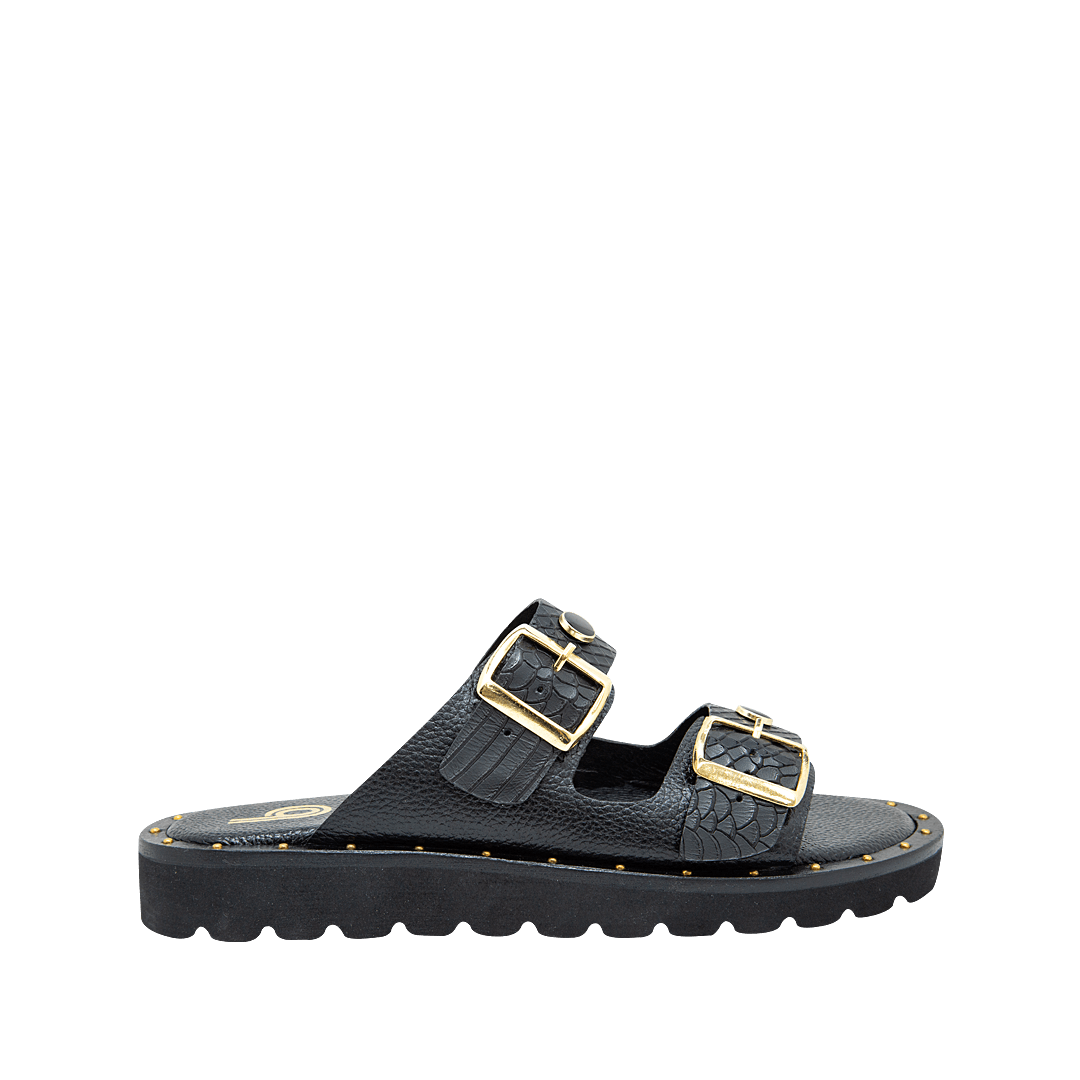 ¡Combinación de estilo urbano y comodidad! • Sandalia plana para mujer en mezcla de cuero granito y grabado color cacao • Piedras decorativas en la capellada • Acabado en punta ovalada • Hebillas laterales • Plataforma liviana dentada • Hecho a mano en Colombia.