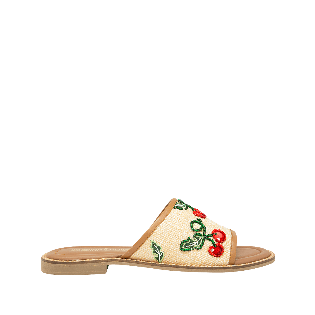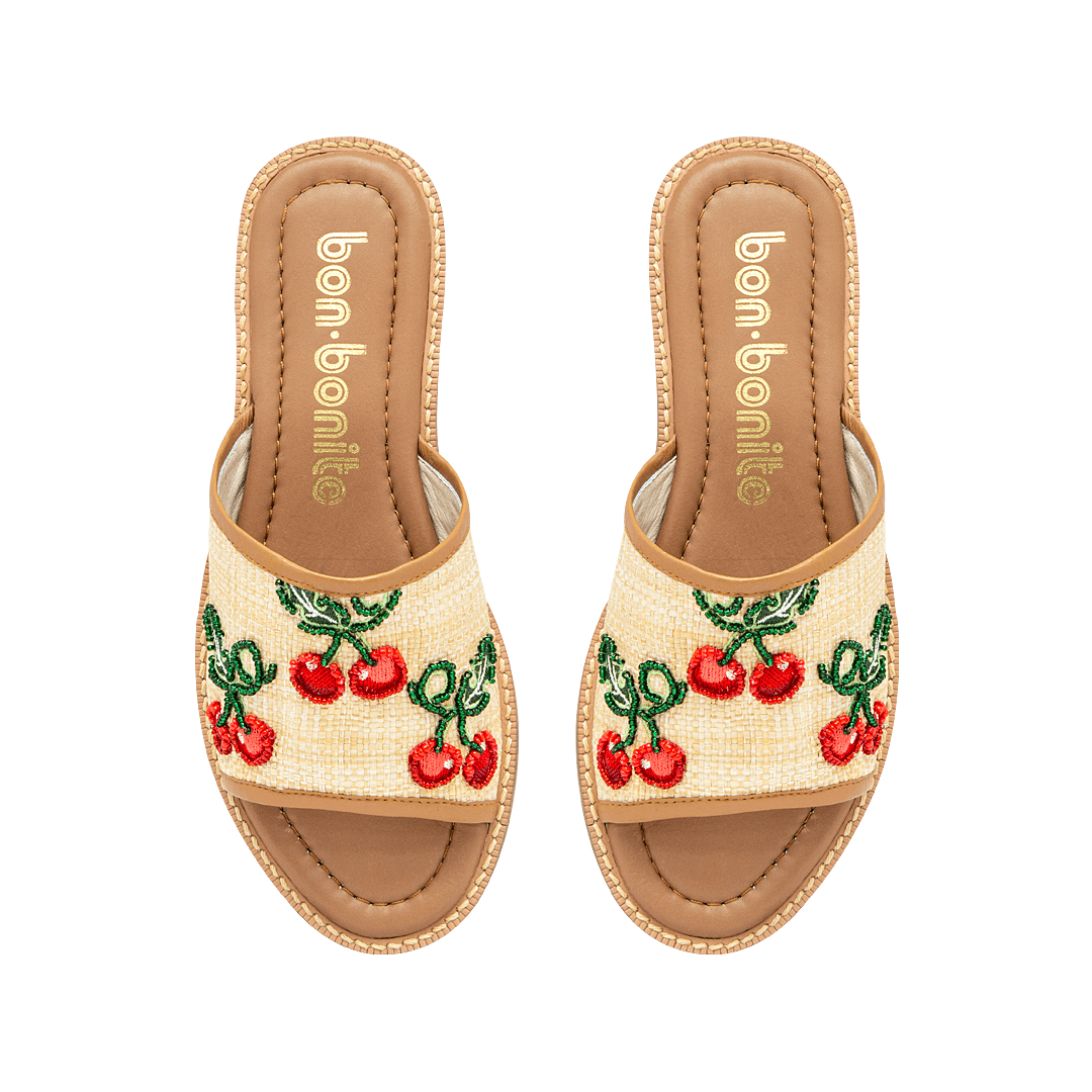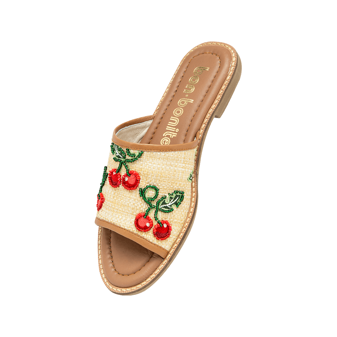 ¡La opción perfecta para un look casual! • Sandalia plana para mujer en rafia con cerezas bordadas con chaquiras • Acabado en punta ovalada • Hecho a mano en Colombia.
