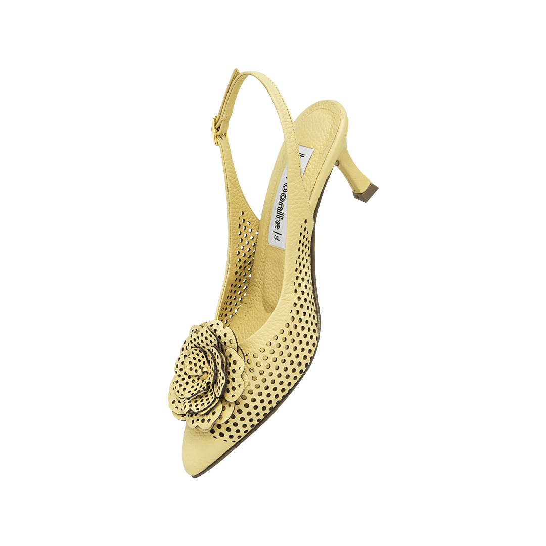 ¡Infaltable en tu clóset! • Tacón para mujer en cuero perforado con láser color jewel con flor decorativa en la capellada • Hebilla lateral para mejor ajuste • Acabado en punta • Tacón forrado en cuero • Hecho a mano en Colombia.