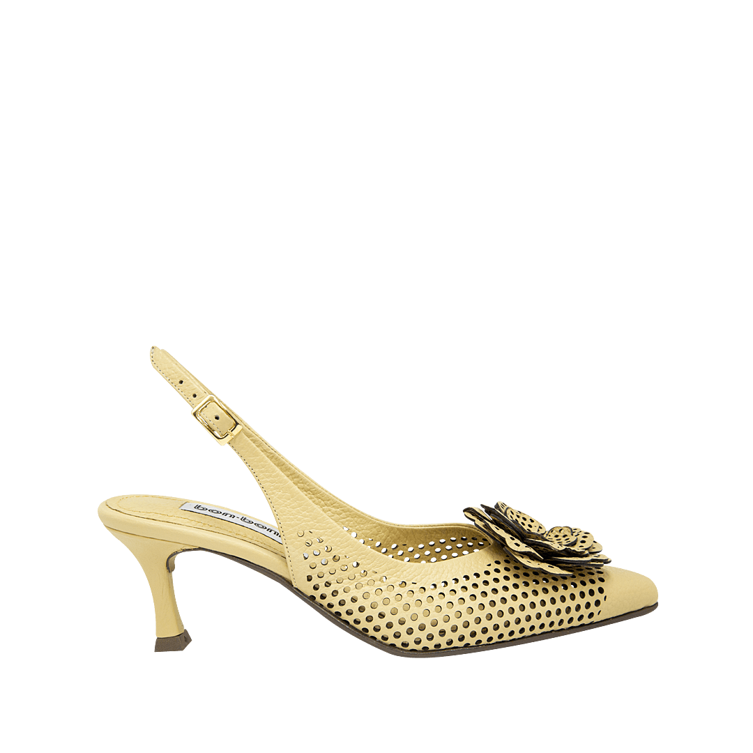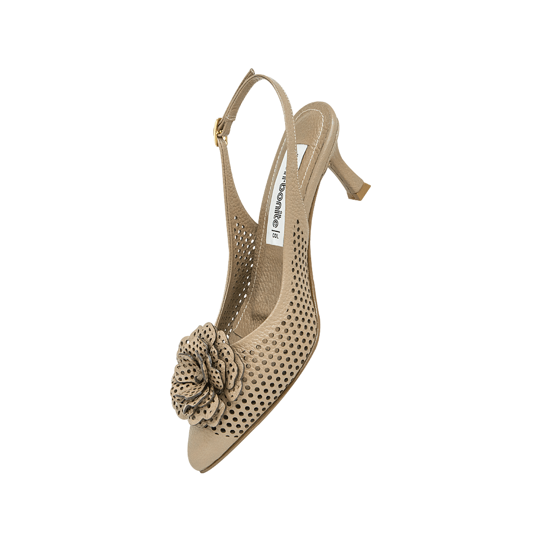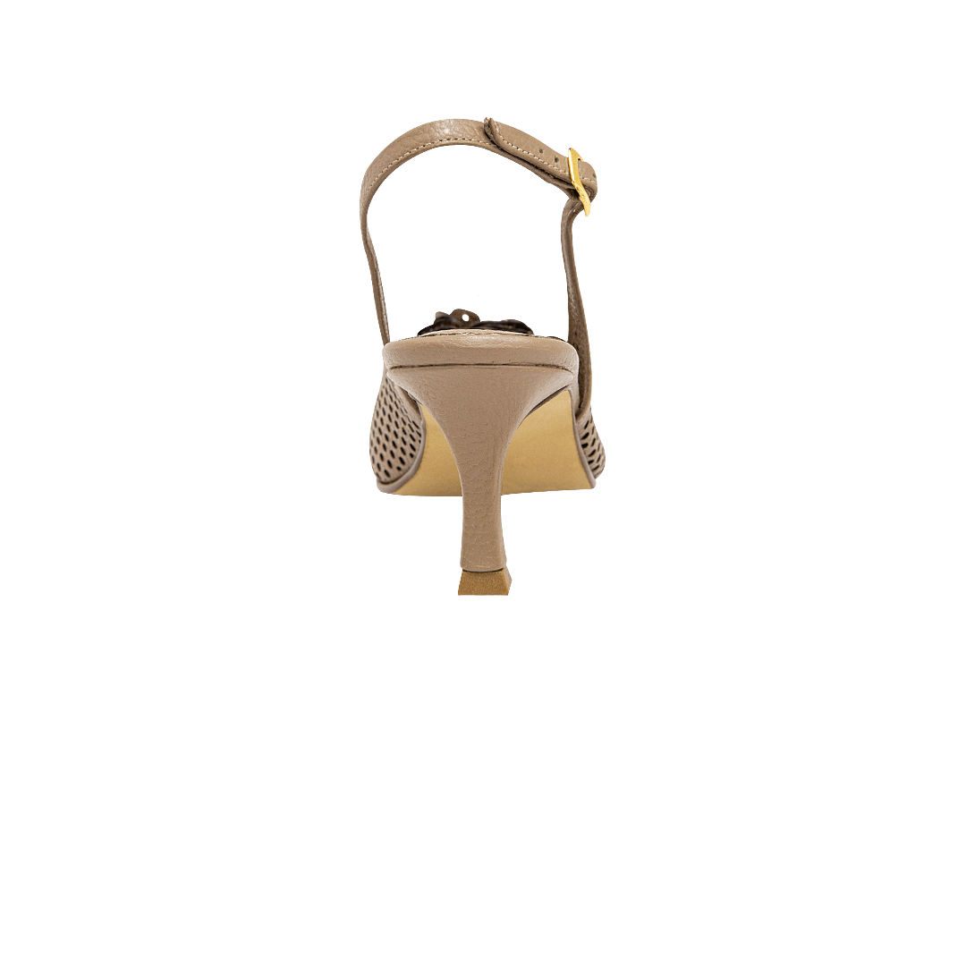 ¡Infaltable en tu clóset! • Tacón para mujer en cuero perforado con láser color taupe con flor decorativa en la capellada • Hebilla lateral para mejor ajuste • Acabado en punta • Tacón forrado en cuero • Hecho a mano en Colombia.