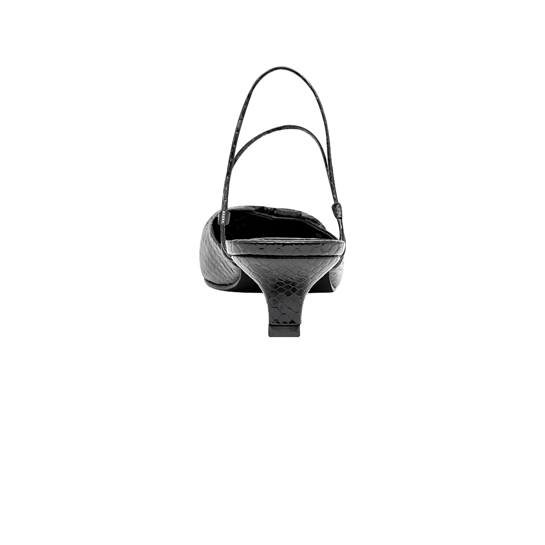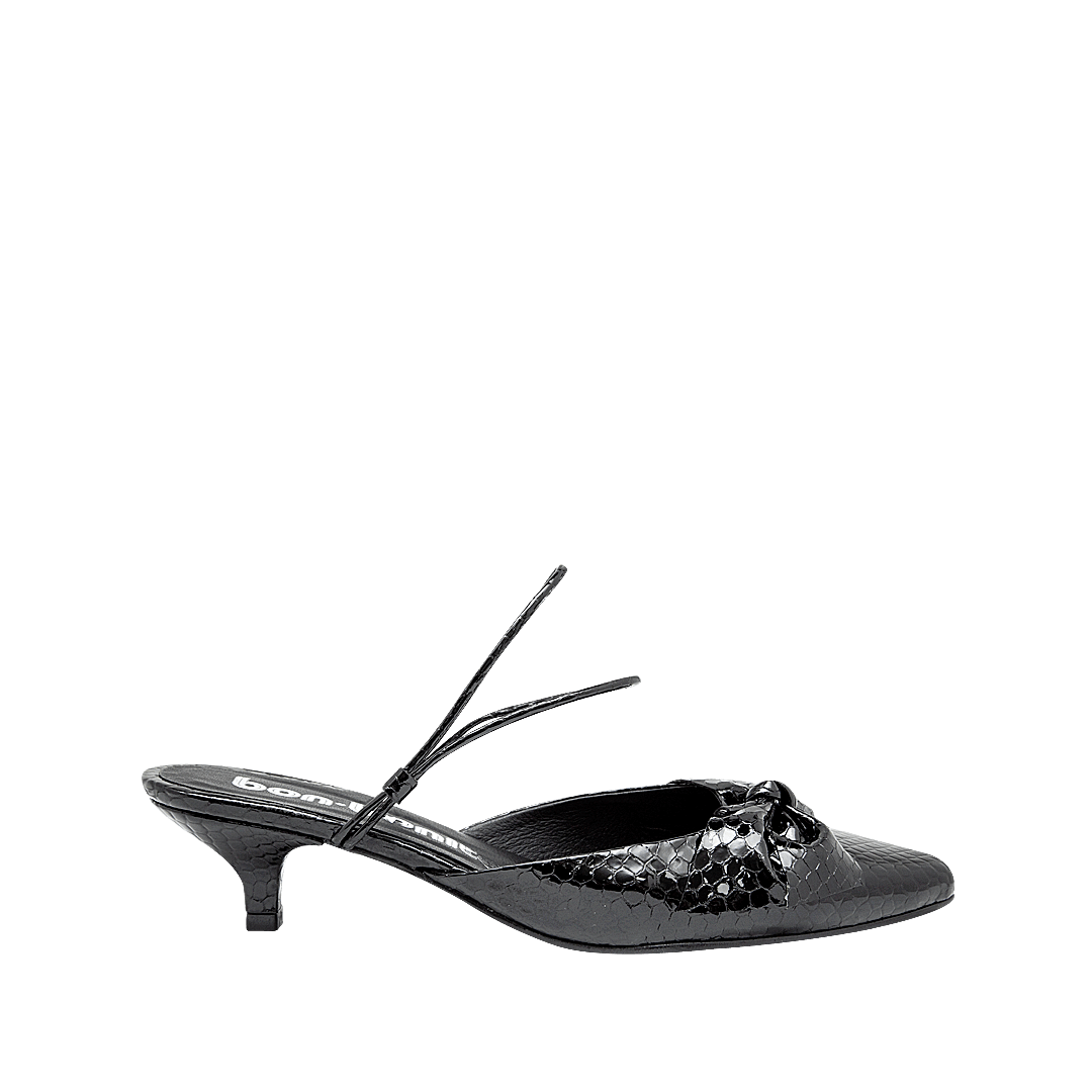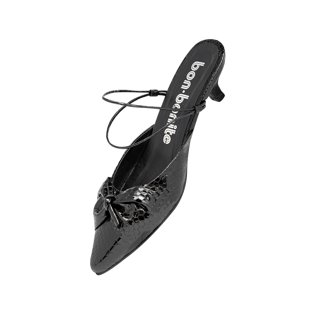 ¡Perfecto para elevar tu presencia! • Tacón con moño para mujer en cuero charolado negro ónix • Acabado en punta • Mini tacón forrado en cuero • Hecho a mano en Colombia.