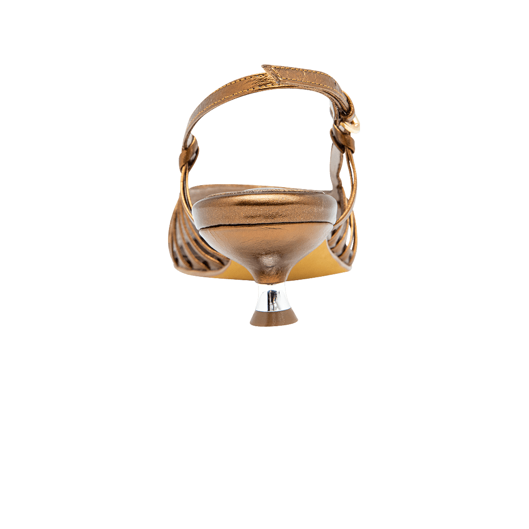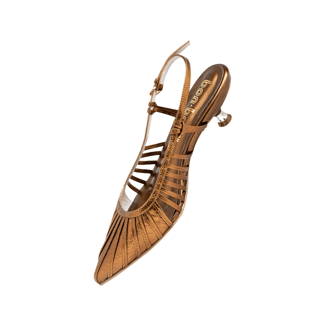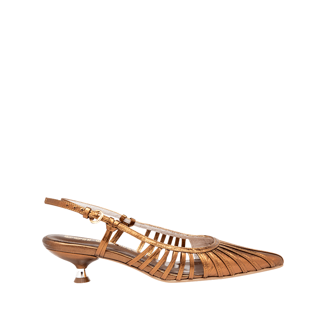 ¡Para acompañarte en cualquier ocasión! • Tacón para mujer con tiras en cuero metalizado bronce • Acabado en punta • Hebilla lateral • Talón descubierto • Mini tacón forrado en cuero • Hecho a mano en Colombia.