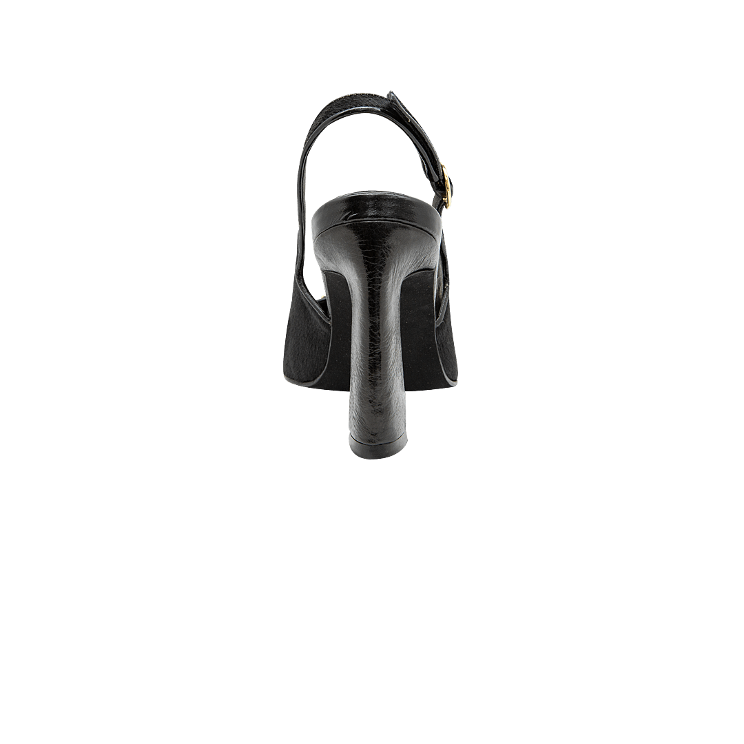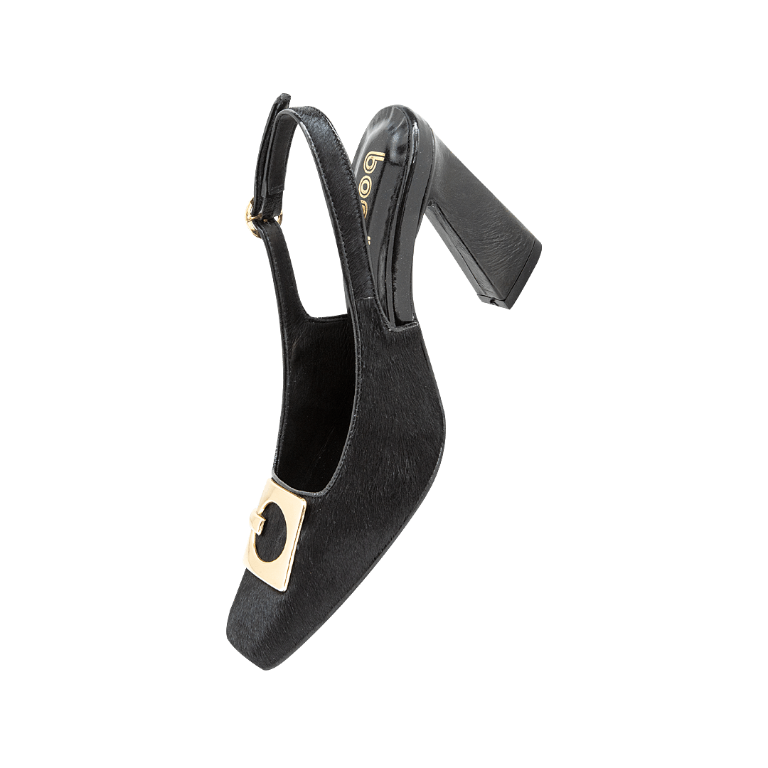 ¡Atrevido, elegante y divertido! • Tacón para mujer en pelo color color negro ónix • Aplique decorativo en la capellada • Acabado en punta cuadrada • Hebilla lateral para mejor ajuste • Tacón geométrico forrado en cuero • Hecho a mano en Colombia.