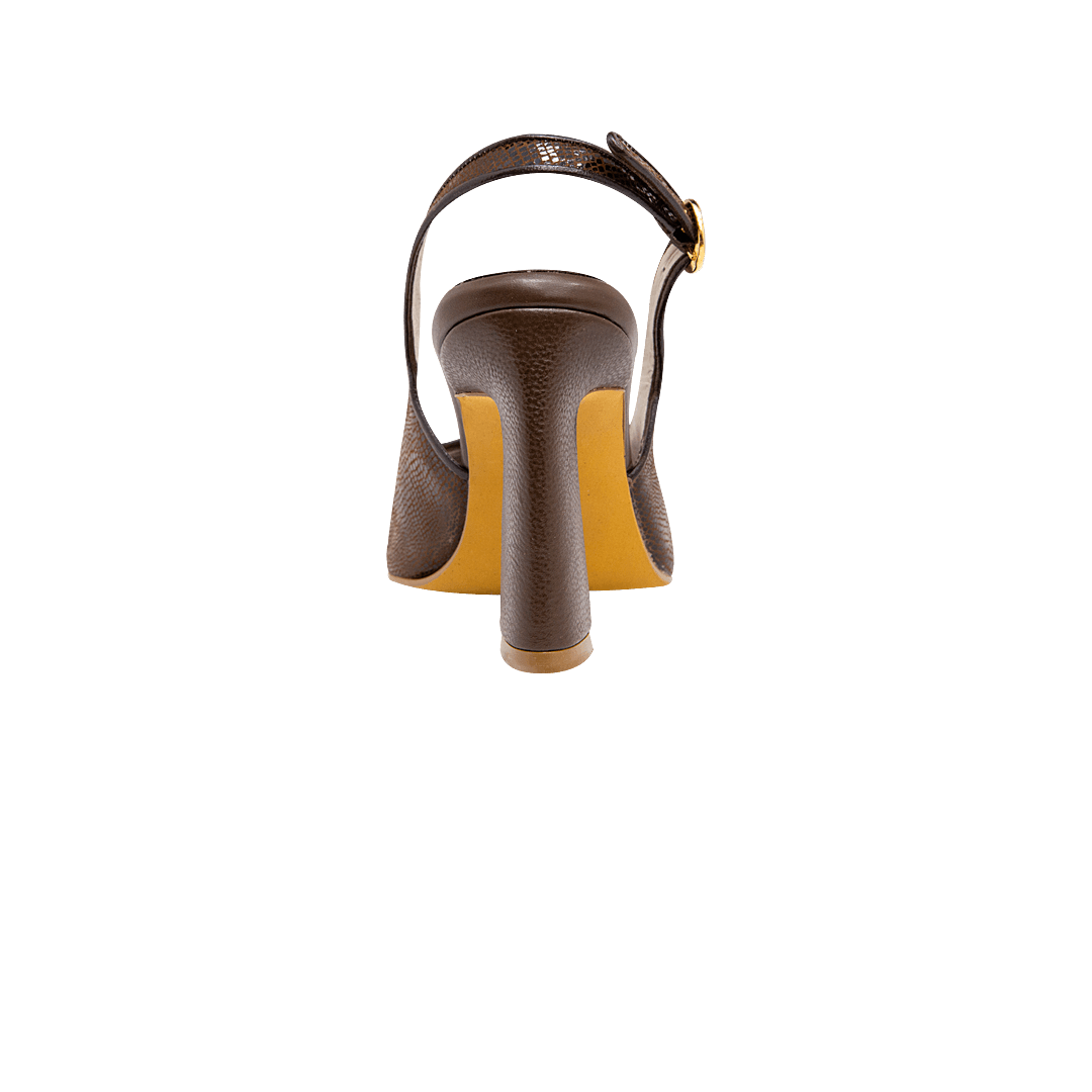 ¡Atrevido, elegante y divertido! • Tacón para mujer en cuero color chocolate • Aplique decorativo en la capellada • Acabado en punta cuadrada • Hebilla lateral para mejor ajuste • Tacón geométrico forrado en cuero • Hecho a mano en Colombia.