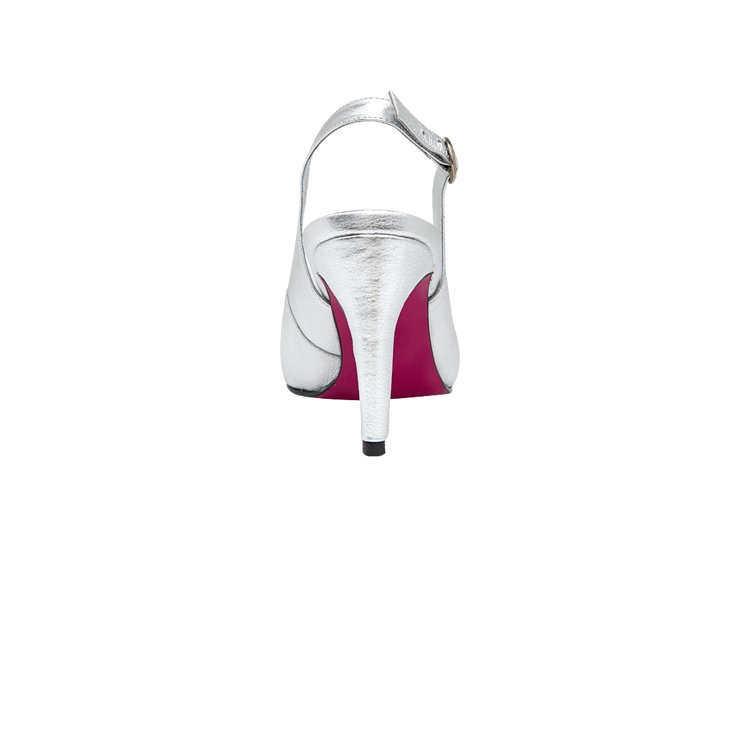 ¡Elegancia y estilo! • Tacón para mujer tipo stiletto en cuero metalizado color plata • Acabado en punta • Hebilla lateral para mejor ajuste • Tacón geométrico forrado en cuero • Hecho a mano en Colombia.