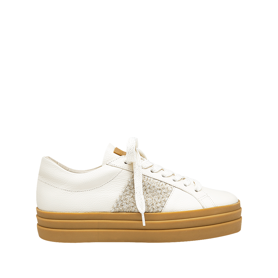 ¡Perfectos para brillar sin esfuerzo, de día o de noche! • Tenis de plataforma para mujer en mezcla de cuero carnaza, metalizado y liso color bronce, tabaco y blanco crema • Laterales en rafia • Acabado en punta redonda • Cordones en textil • Hecho a mano en Colombia.