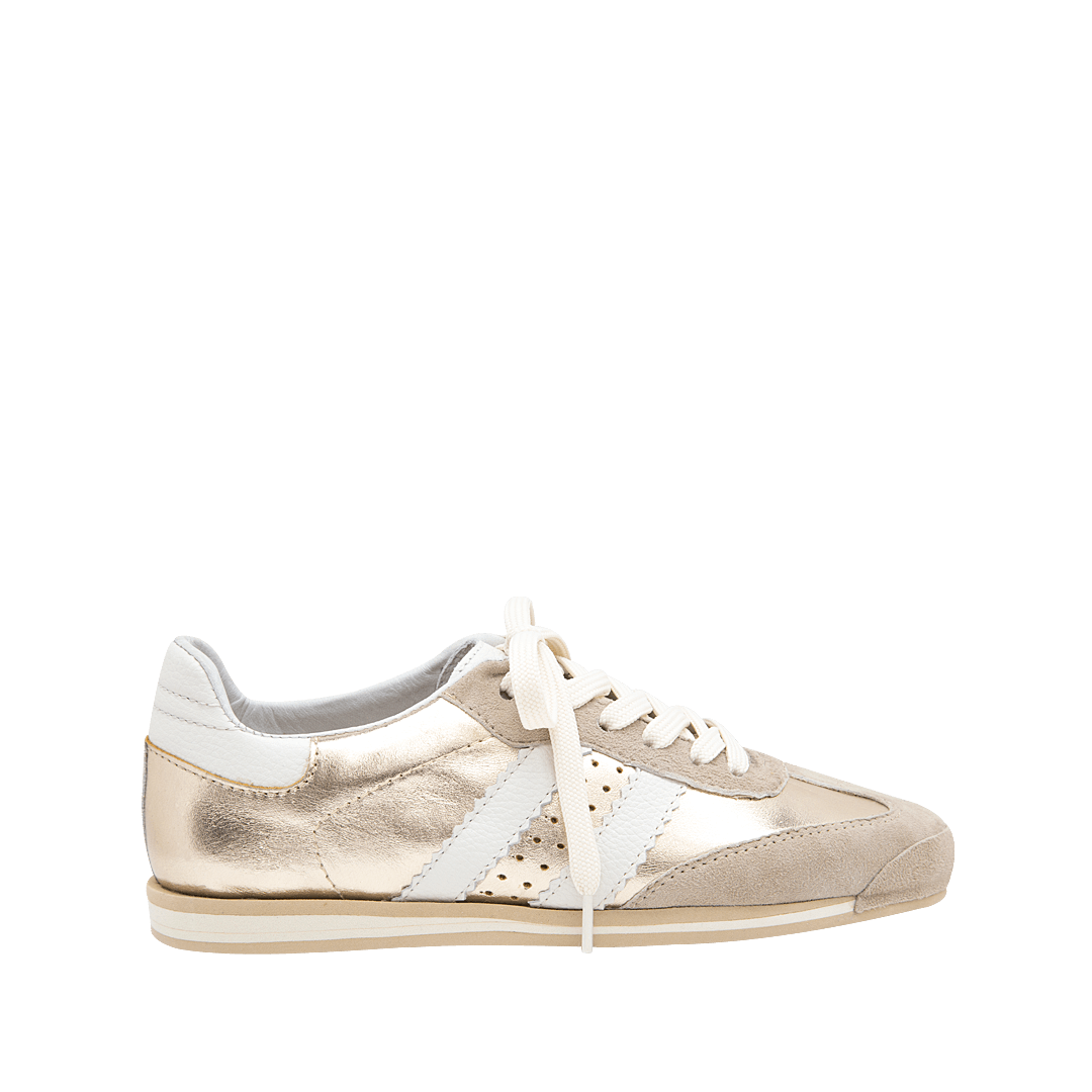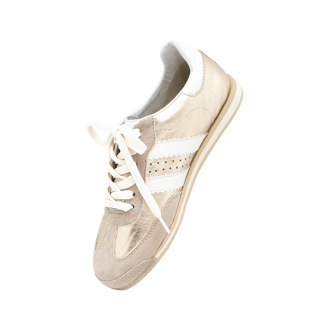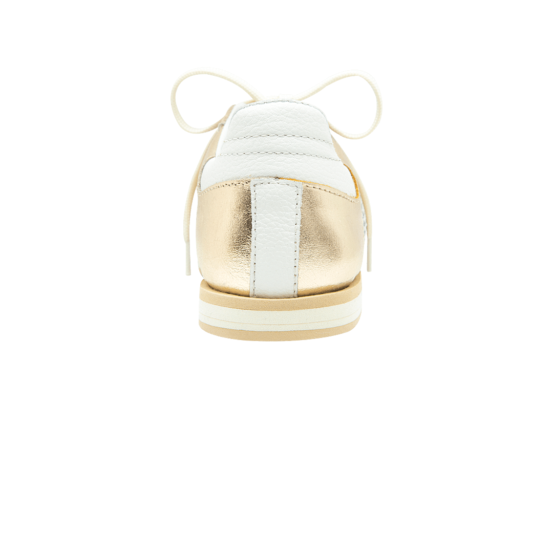 ¡Estilo sin límites! • Tenis para mujer en mezcla de cuero metalizado, granito y carnaza color oro por arena y blanco suizo • Acabado en punta redonda • Laterales en cuero color blanco • Cordones en textil • Hecho a mano en Colombia.