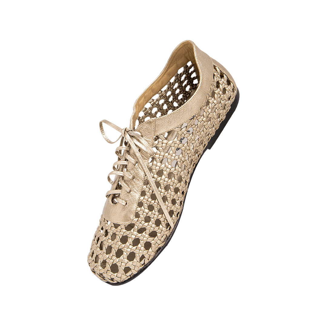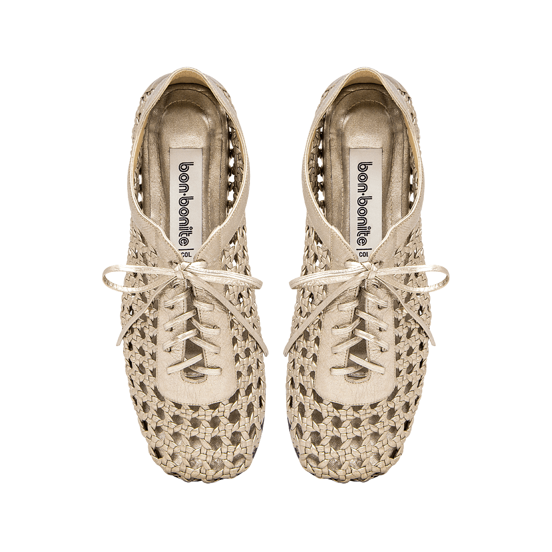 ¡El complemento ideal para cualquier ocasión! • Zapato de atadura para mujer en cuero tejido de manera artesanal color luna • Cordón en cuero • Acabado en punta cuadrada • Mini tacón en caucho • Hecho a mano en Colombia.