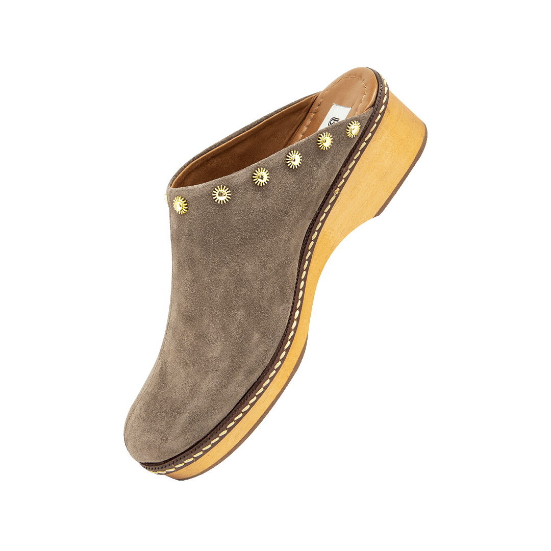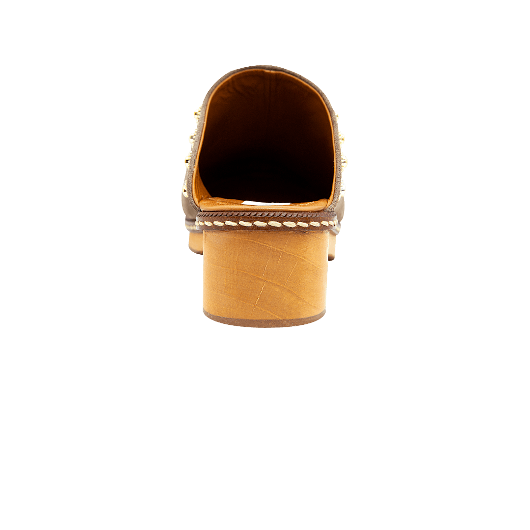 ¡Diseño práctico que no sacrifica el estilo! • Zueco de tacón para mujer en cuero carnaza color almendra con taches decorativos • Acabado en punta ovalada • Tacón y plataforma en madera • Hecho a mano en Colombia.